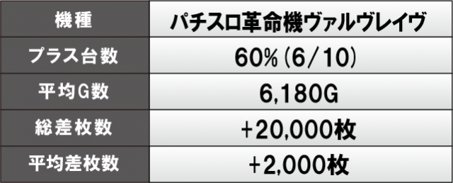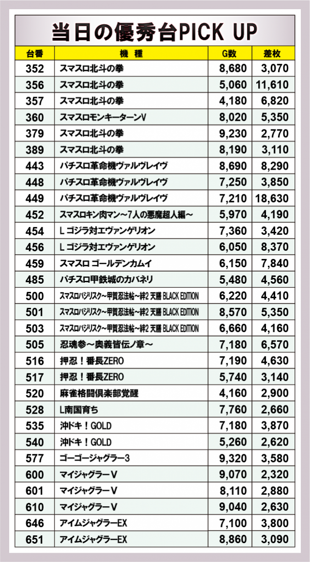 優秀台に目を通してみると、『パチスロ革命機ヴァルヴレイヴ』449番台+18,630枚、『スマスロ北斗の拳』356番台+11,610枚と2台の万枚オーバーが存在し、大きな熱気が放たれていたのが目に焼きつく。