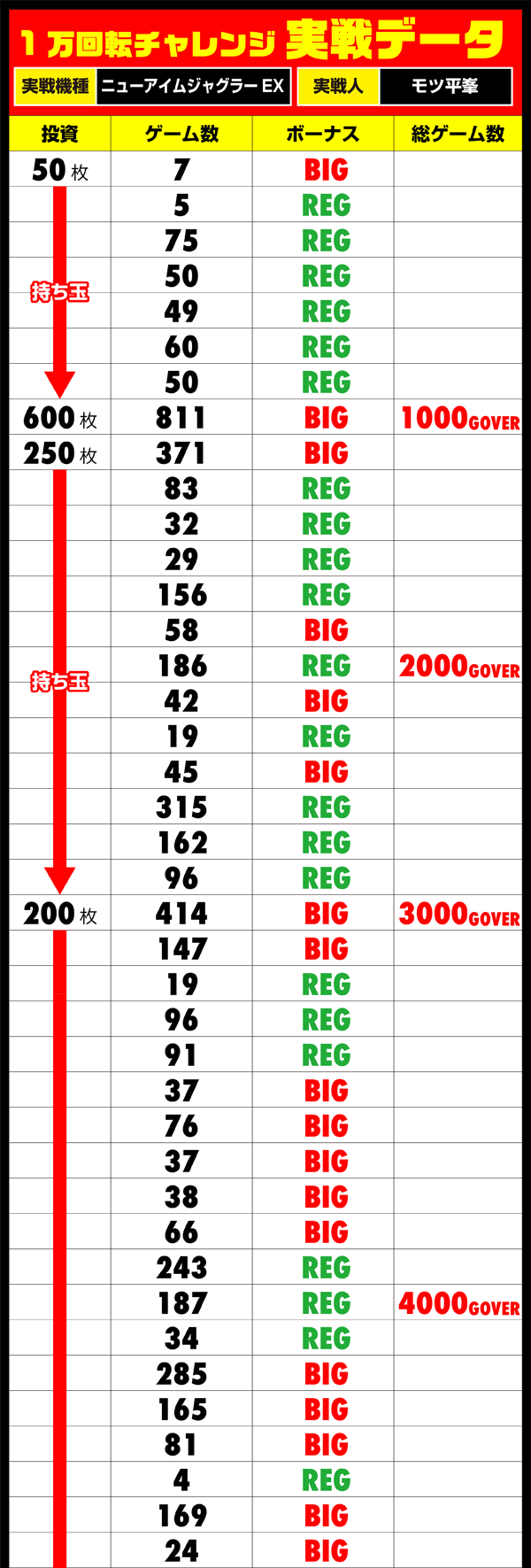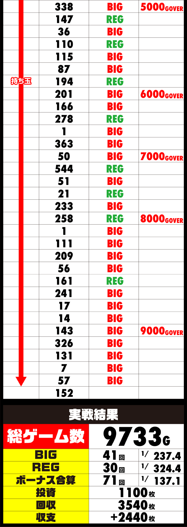 夕方までは1万回転達成のペースであったはずが後半にはBIGの回数がREGを抜いてしまい、ボーナスの消化に悪戦苦闘。
