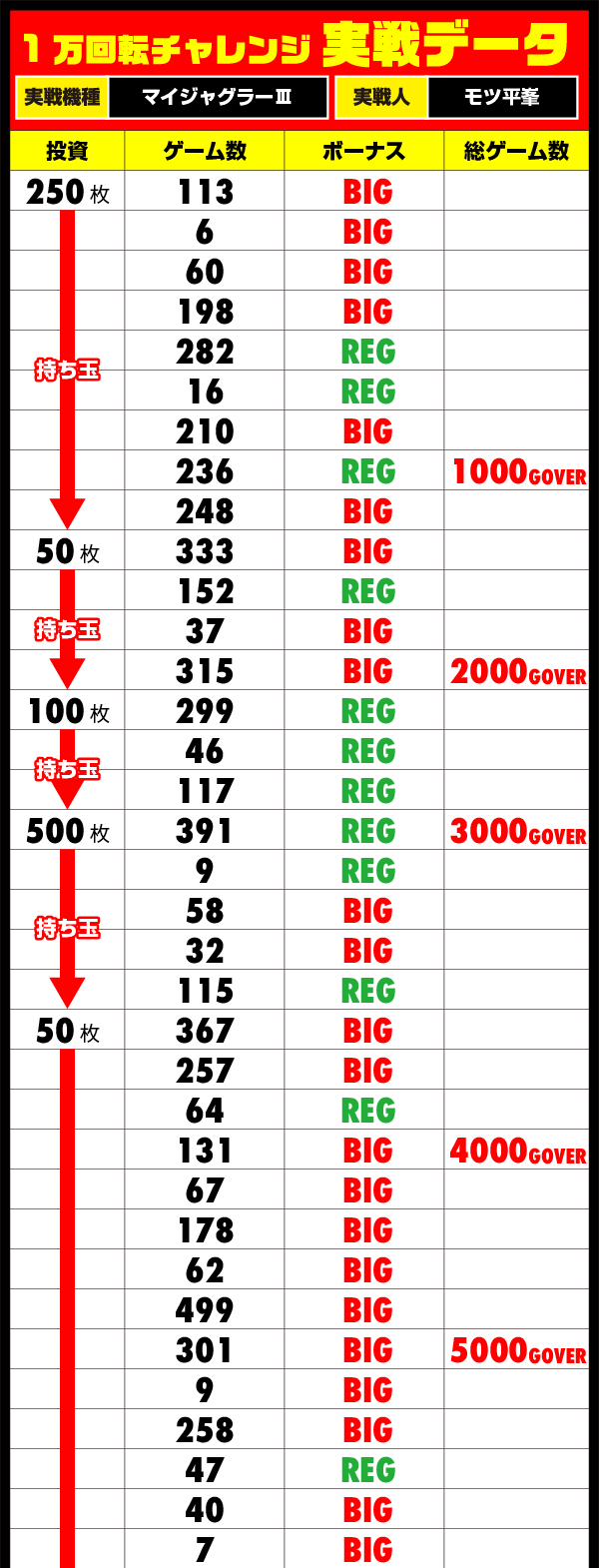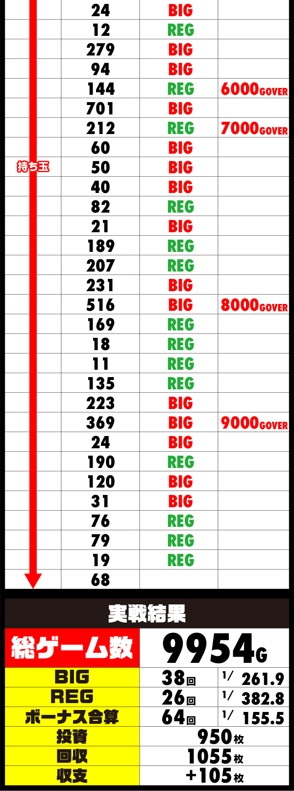 後半はスパートをかけたいところではあったが、6000G付近からボーナスの連打がはじまる。
