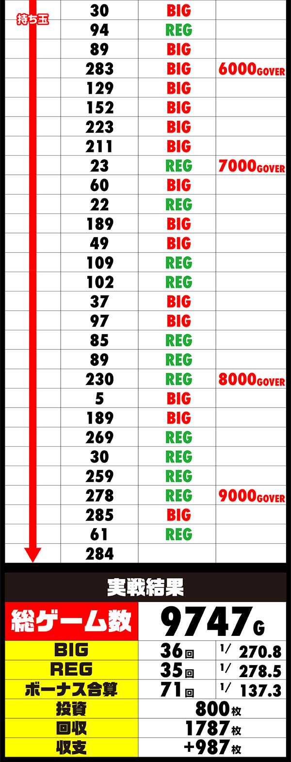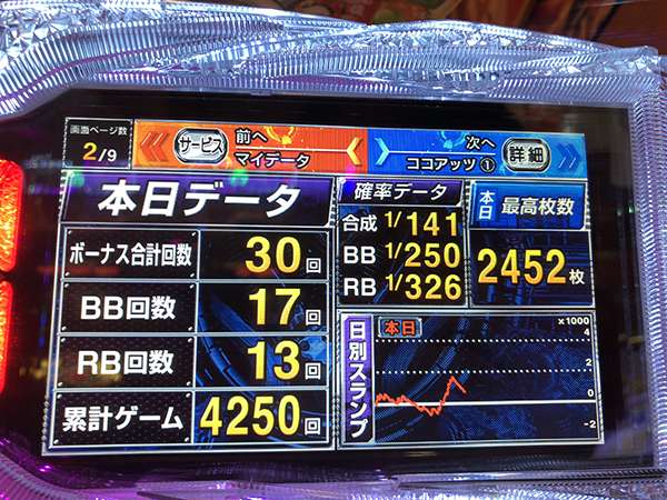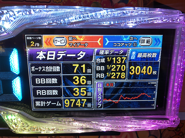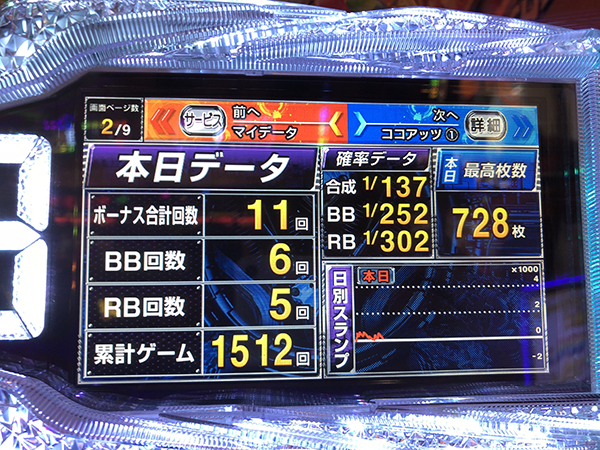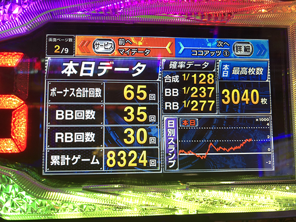 夕方以降には、序盤と中盤以上に良いテンポでボーナスをゲット。BIGとREGの消化にかかった時間が大きなタイムロスをうんでしまっていた。