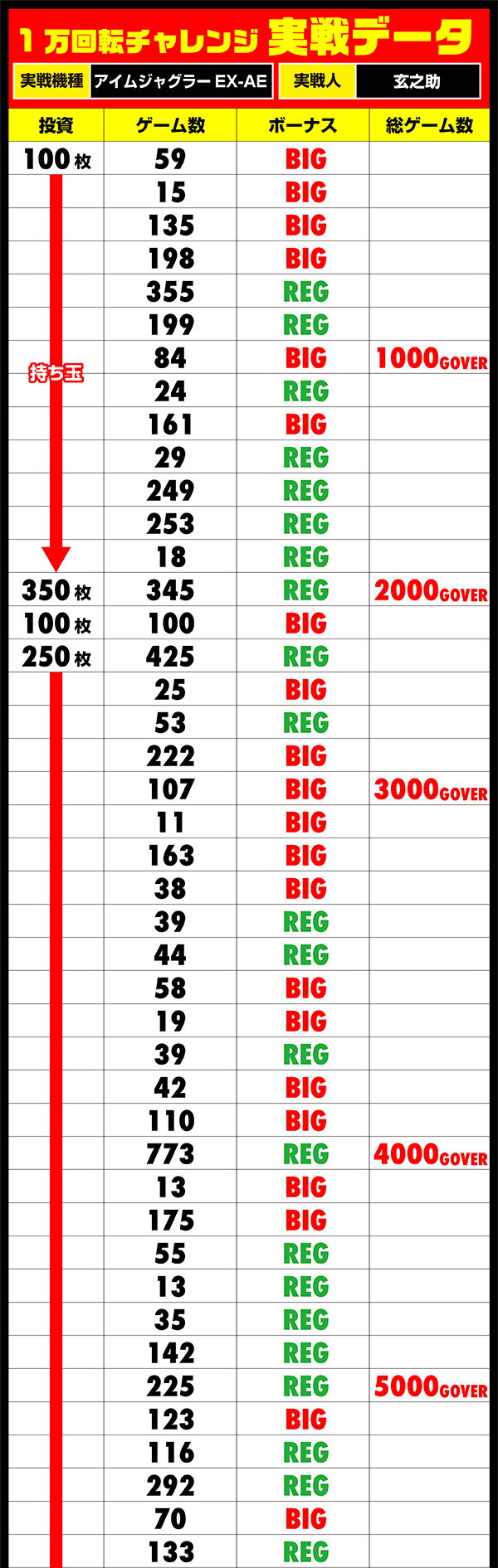 チャレンジを開始してすぐにボーナス獲得かつBIGを連打と、ある程度の持ち玉をつくることに成功した玄之助。プレイヤーとの会話でリラックスできたおかげか、順調なペースでレバーを叩き続け、回転数的にも及第点といった序盤であった。