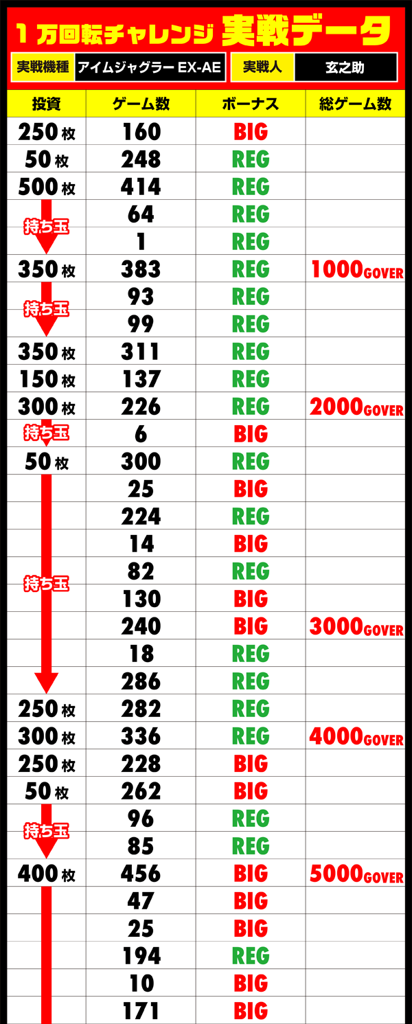 実戦機種の「アイムジャグラーEX-AE」においては、精神力が試されるように出玉は伸びず、2000G到達までに獲得したBIGはたったの1回。