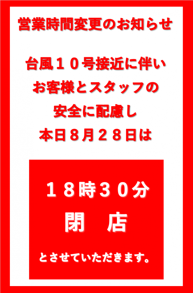 台風10号接近に伴い8月29日臨時休業いたしますm(__)m