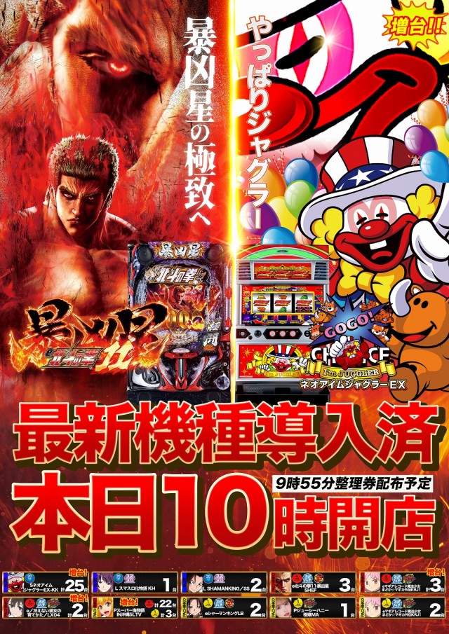 本日10時開店!話題の最新台も導入済み!お待ちしております♪