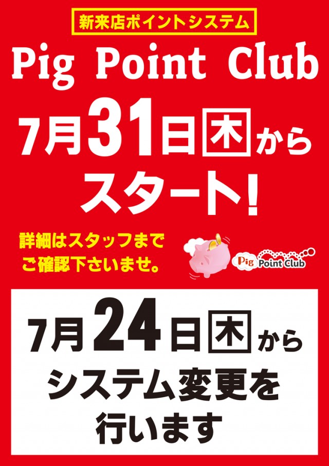 ▪️来店ポイントシステム▪️Pig Point Club7月31日スタート!!