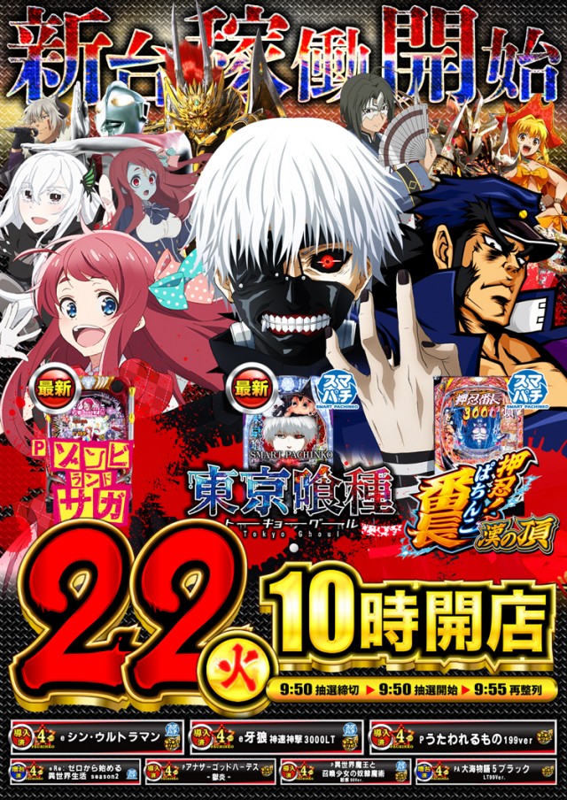 本日22【火】e 東京喰種 吉宗 他稼働開始!