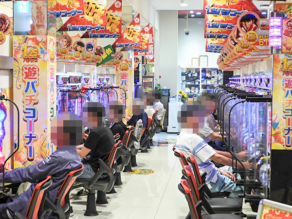 パチンココーナーの貸し玉料金は、4円と1.25円の2種類を用意。中でも1.25円の人気が高く、ほぼ満席となるほどの盛況ぶりだった。