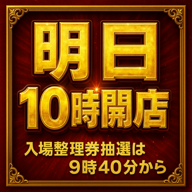 明日、新台入替朝10時開店 入場整理券は9時40分~抽選!!