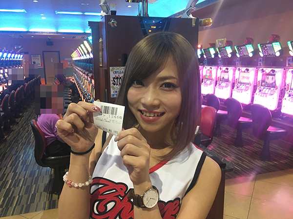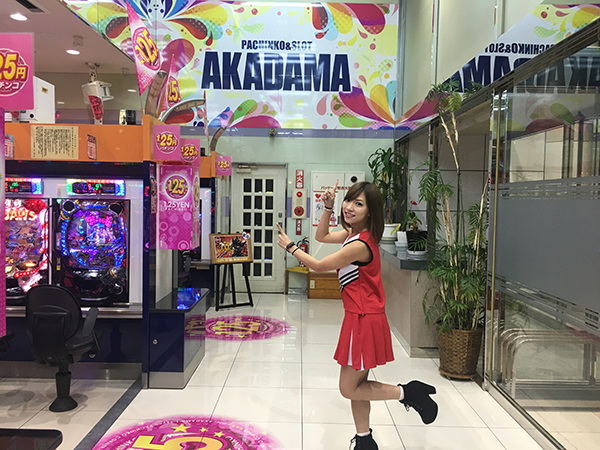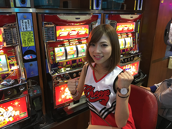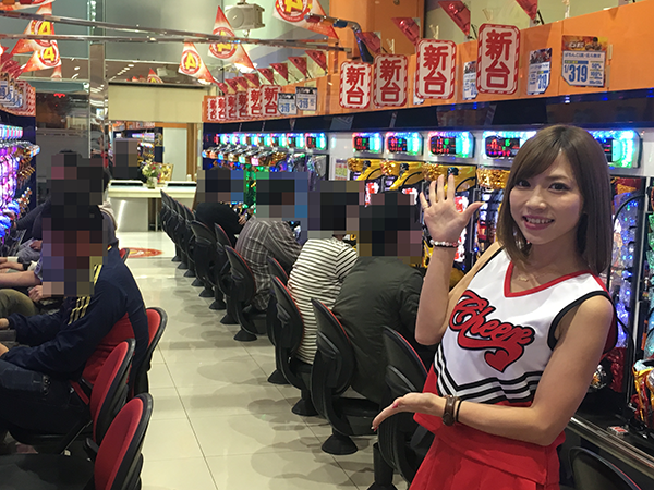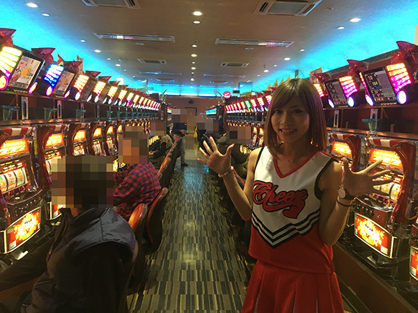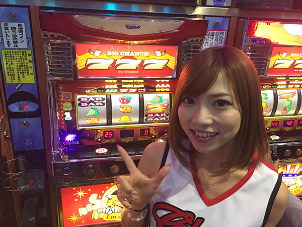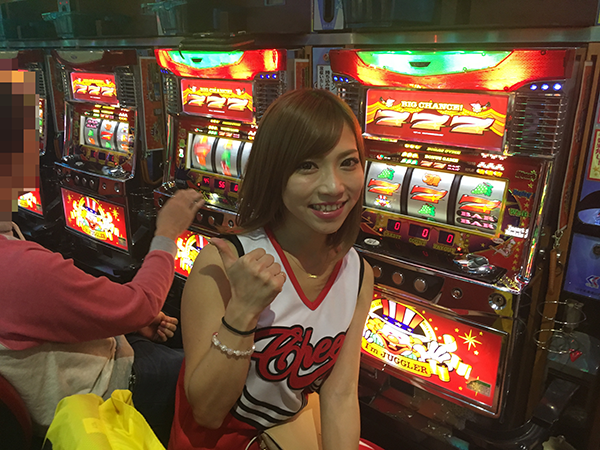 パーラー赤玉中郷店で厚い支持を受けている「ジャグラーシリーズ」の中から「ニューアイムジャグラーEX」を選択。ガッツポーズで、頑張るアピールも忘れません!