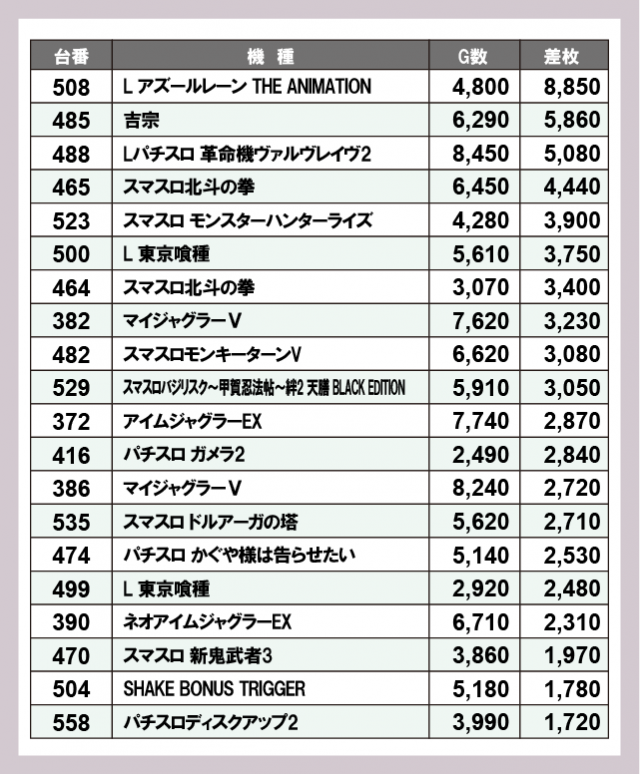 機種別差枚ランキング