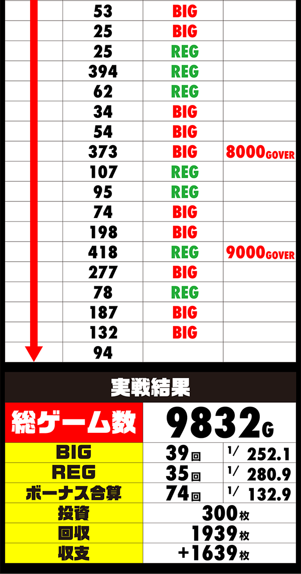 大きくハマることなくボーナスを引き続けるも好調さがあだとなり、1万回転到達にあと一歩、とどかずに実戦終了…。