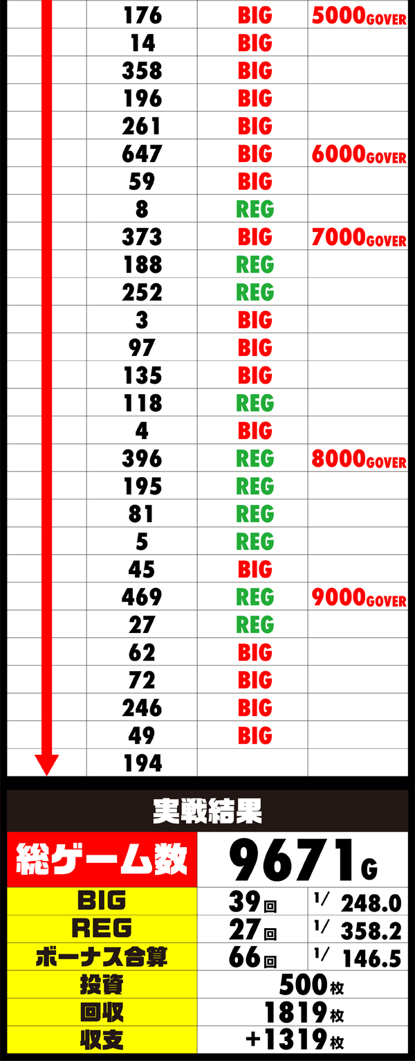 チャレンジの展開をみると、前半からボーナス回数を増やしつつ、しっかりと通常時の総回転数を伸ばしていた。
