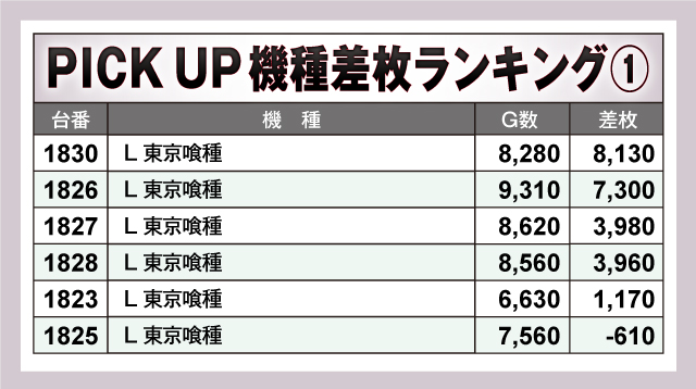 つづいて『L 東京喰種』1830番台が+8,130枚、1826番台も+7,300枚。『スマスロ北斗の拳』2030番台が+7,910枚と見事な成績となった。以下にも『パチスロ かぐや様は告らせたい』1818番台が+6,700枚、『スマスロ モンスターハンターライズ』2003番台が+6,410枚と、超優秀台がズラリと並ぶ大迫力のランキングが出来あがっている。