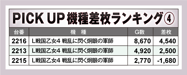 『スマスロスーパーブラックジャック』は3台すべてがプラス差枚となる優秀ぶり。『L戦国乙女4 戦乱に閃く炯眼の軍師』はG数の多さと差枚が比例するような結果となった。