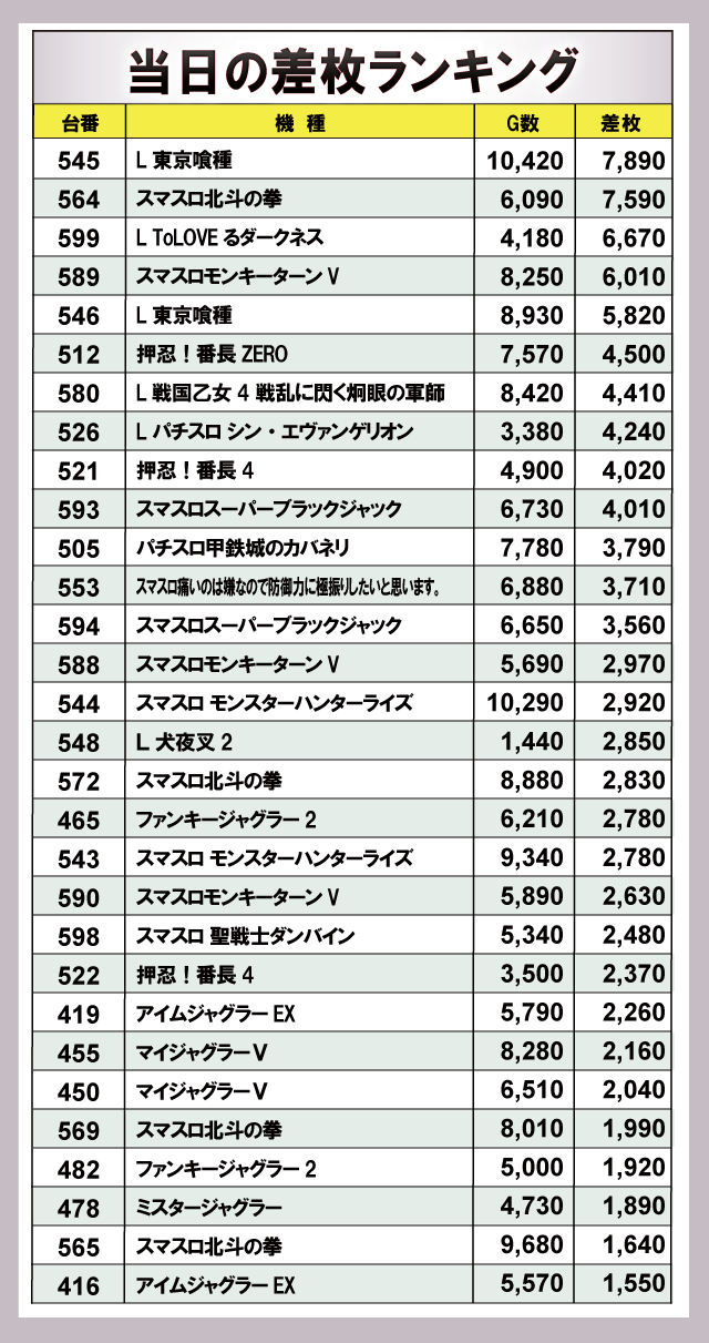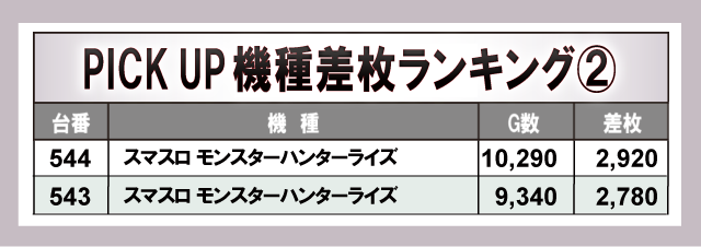 上表をみて特に注目してほしいのは『L 東京喰種』『スマスロ モンスターハンターライズ』『スマスロスーパーブラックジャック』『スマスロモンキーターンV』の4機種が全台プラス差枚数を達成しているということだ。さらに『L 東京喰種』『スマスロ モンスターハンターライズ』は万回転も記録しており、ファンは打ちごたえのある状況に歓喜していたはずだ。