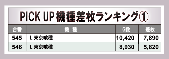 『L 東京喰種』『スマスロ北斗の拳』から+7,000枚OVERが発生し、店内は大きな熱気に包まれていたようだ。それに続き『L ToLOVEるダークネス』『スマスロモンキーターンV』から+6,000枚OVERをマークし、スマスロを筆頭に盛り上がりを形成していた。回転数を見ても終日を通して打ち込まれていた様子が窺えるばかりで、活気と熱気に満ちた1日になったようだ。