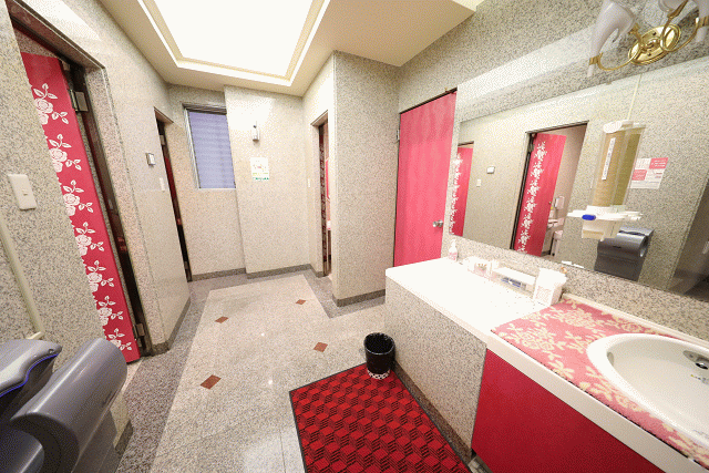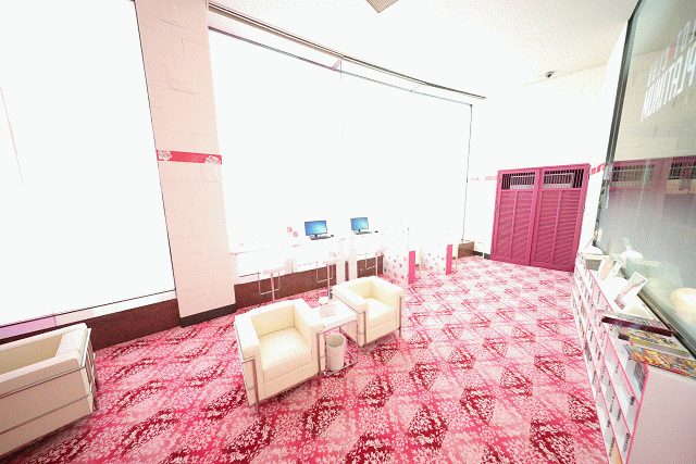 禁断の男子禁制スペースに足を踏み入れるや否や、眼に飛び込んでくるのは華やかな空間!カーペットや調度品の色がショッキングピンクでまるでお花畑の中のよう。