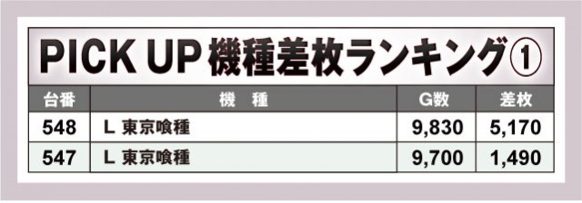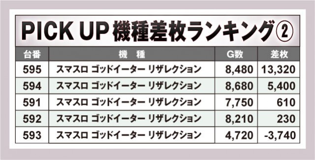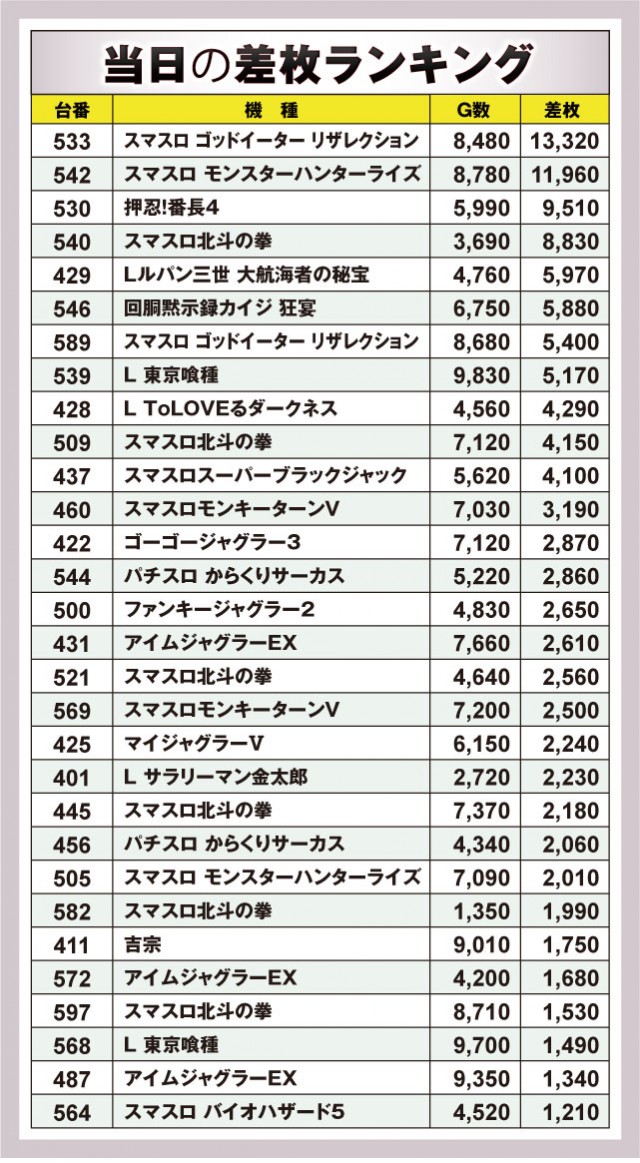 今回のピックアップは3機種。さきほどのランキングのトップ2までに入った2台の万枚台が含まれているが、その他の台の差枚数はご覧の通りだ。