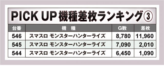 『L 東京喰種』と『スマスロ モンスターハンターライズ』は少台数ながらも全台がプラス差枚数になっている。