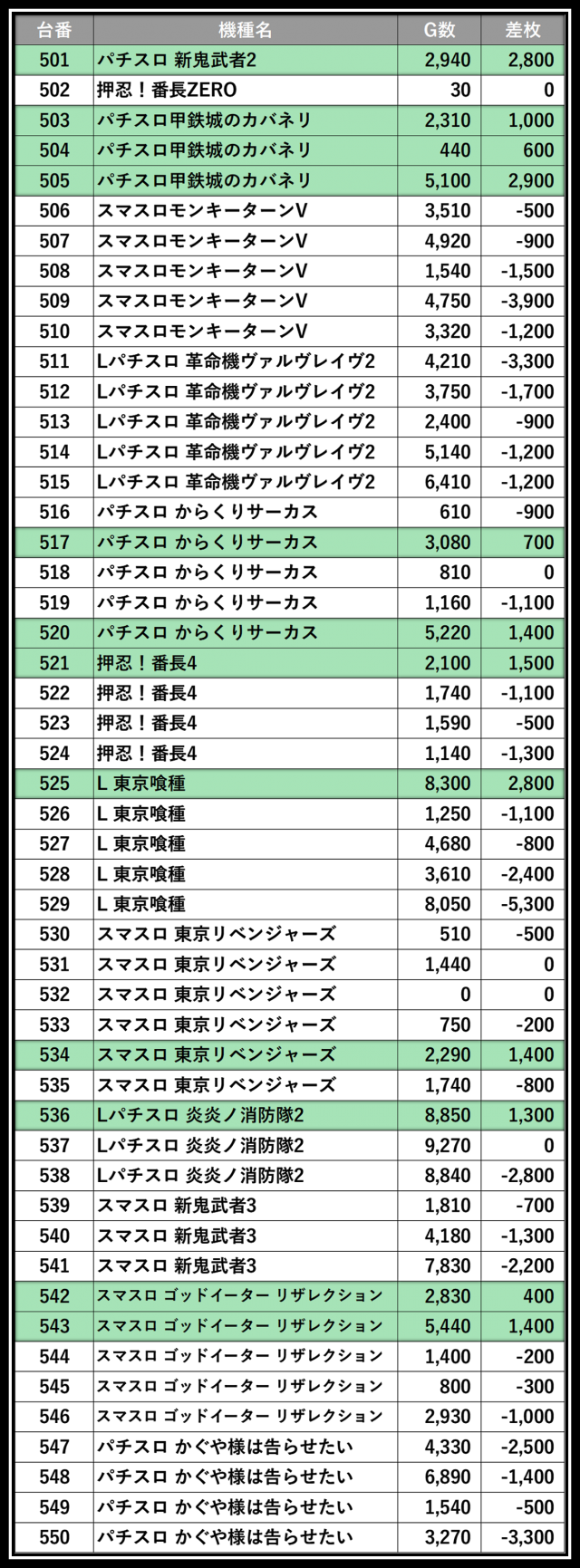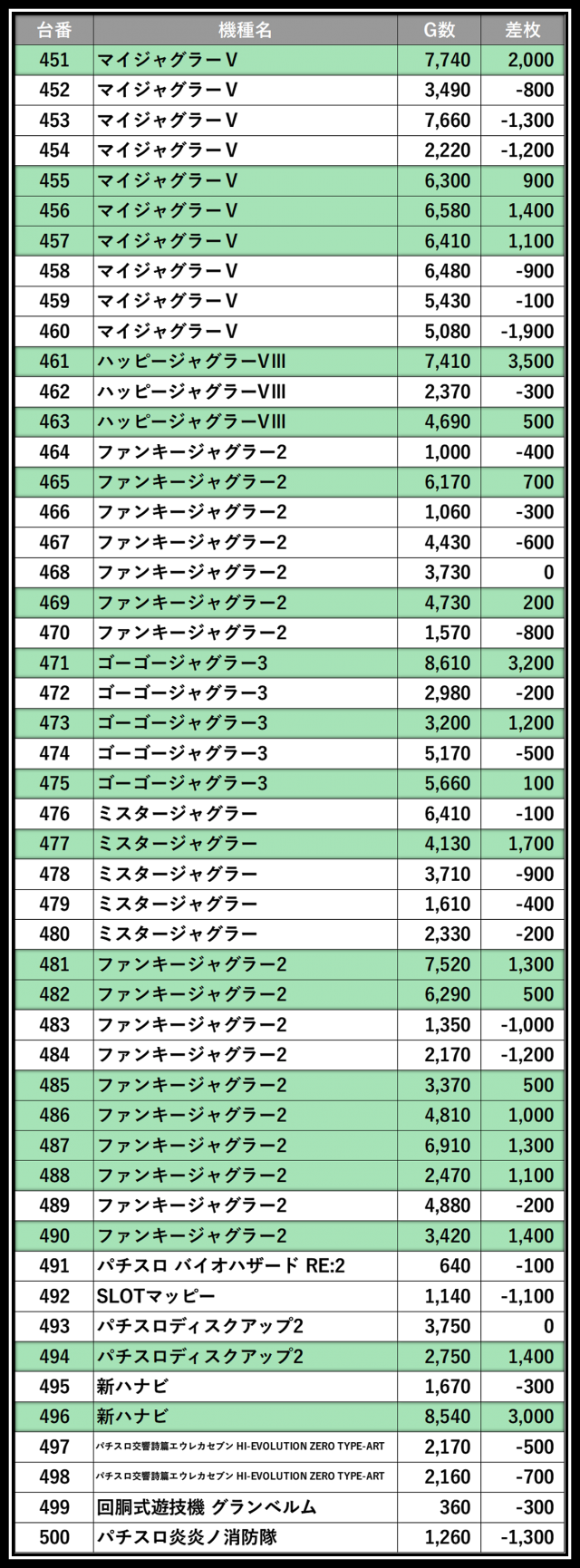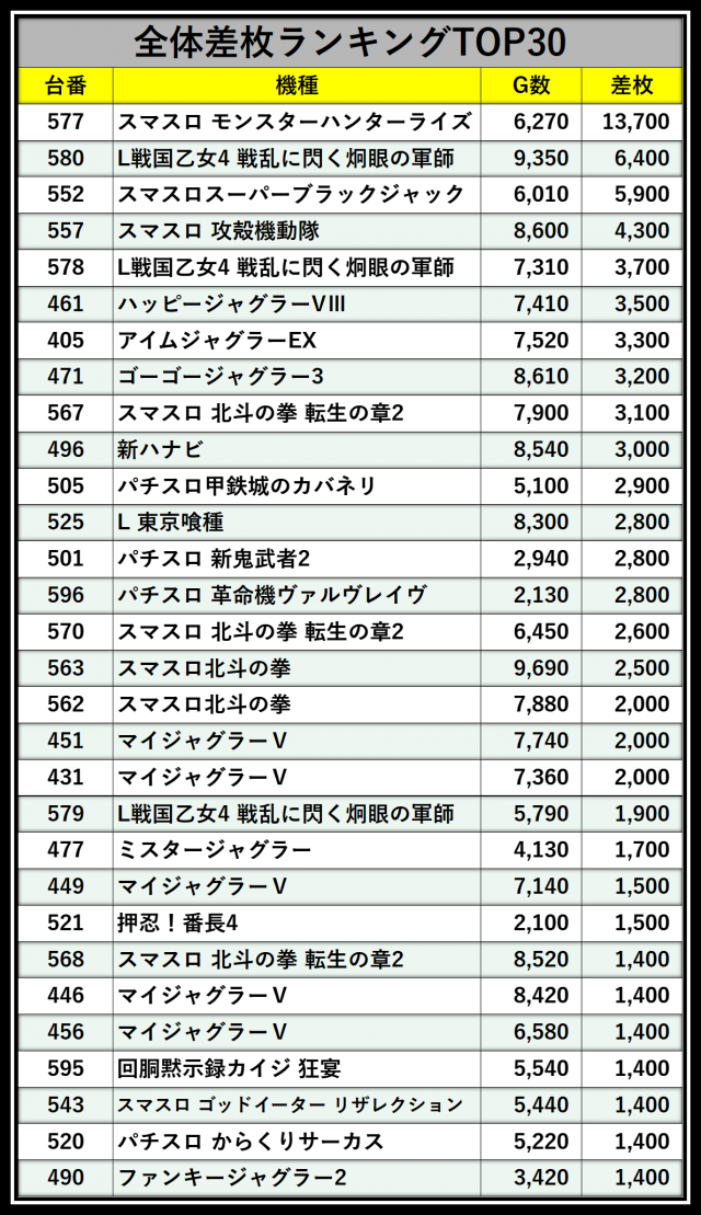 ※差枚数順に掲載しています