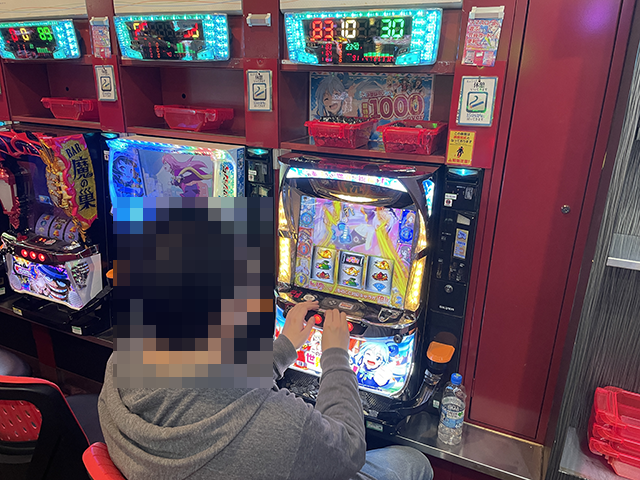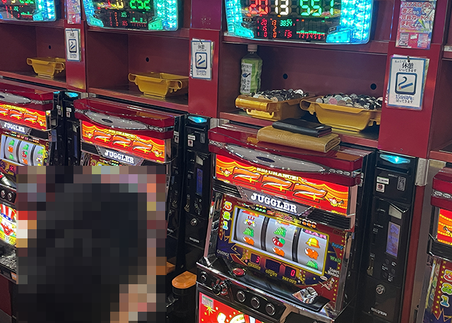 「アイムジャグラーEX」にて、2箱や3箱の持ち玉を使って遊技をおこなう姿をとらえた。