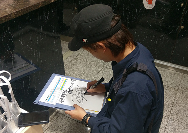 サインをテキパキと書くモツ平峯さんφ(゚-゚=)