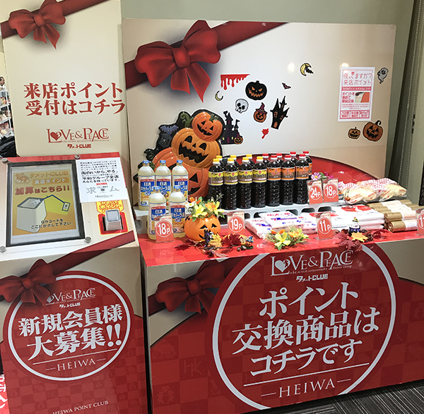 左の受付でポイントが貯まり、貯まったポイントに応じて右の棚に並んでいる商品と交換できる……というシステムですね♪ お醤油や砂糖など、日々の暮らしに欠かせないものが多いのも嬉しいなぁ(^∀^)