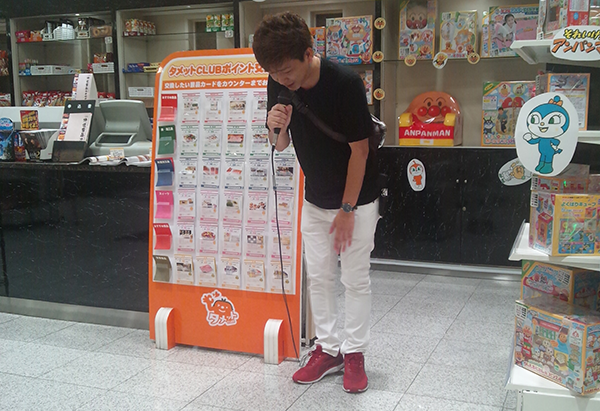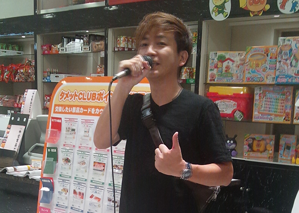 動きをつけて元気いっぱいに挨拶をするモツ平峯さん!