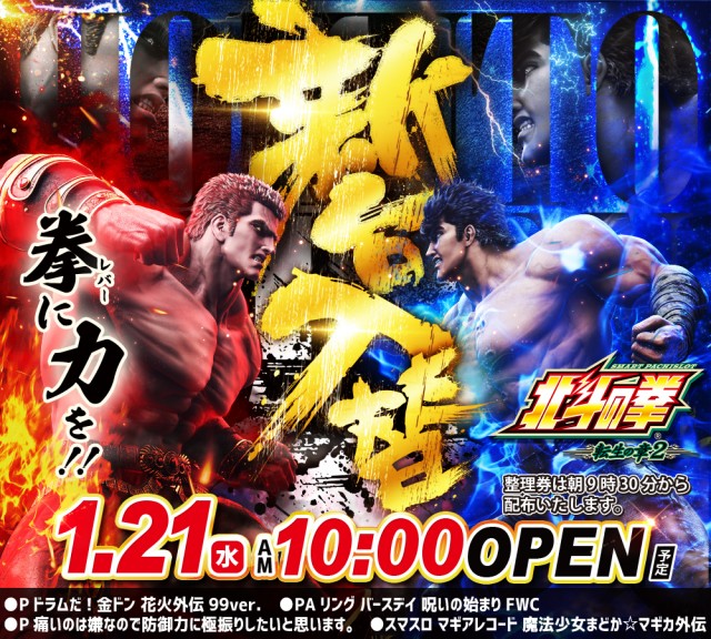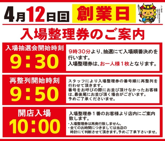 当店が入場時の混雑防止・安全確保の観点から必要だと判断した場合及び、新台入替初日のみ朝9:30より入場整理券を配布致します。※入場整理券は遊技台の確保を確約するものではございません。※店舗正面側A入場口が優先入場口となります。※抽選入場をおこなう場合がございます。 |