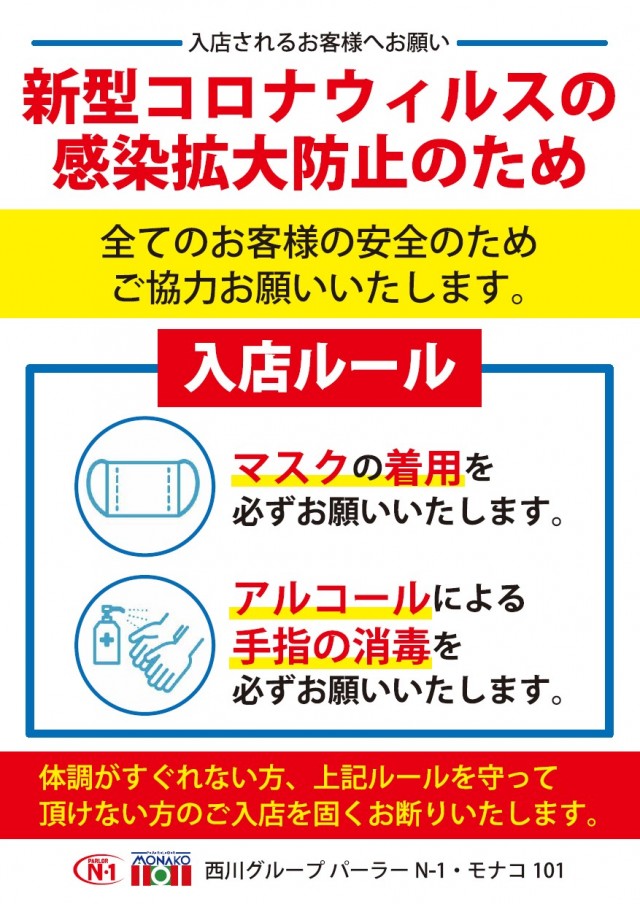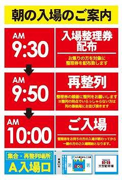 当店が入場時の混雑防止・安全確保の観点から必要だと判断した場合及び、新台入替初日のみ朝9:30より入場整理券を配布致します。※入場整理券は遊技台の確保を確約するものではございません。※店舗正面側A入場口が優先入場口となります。※抽選入場をおこなう場合がございます。 |
