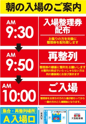 当店が入場時の混雑防止・安全確保の観点から必要だと判断した場合及び、新台入替初日のみ朝9:30より入場整理券を配布致します。※入場整理券は遊技台の確保を確約するものではございません。※店舗正面側A入場口が優先入場口となります。※抽選入場をおこなう場合がございます。 |