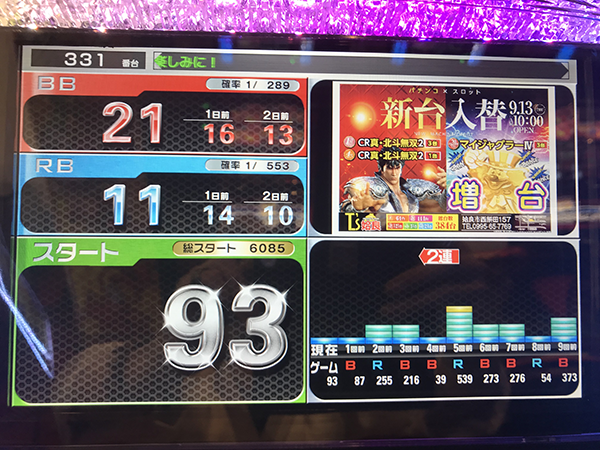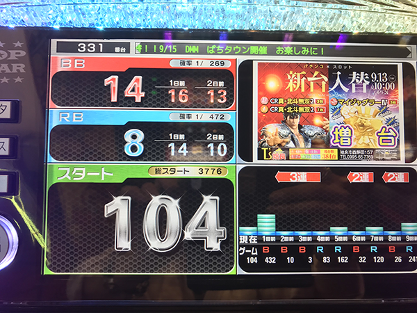 序盤からボーナスのヒキが悪くチャレンジ的には恵まれた展開となるも、BIGが先行してしまいチャンスを活かせず。