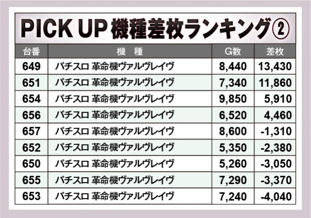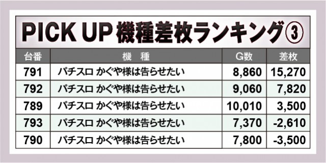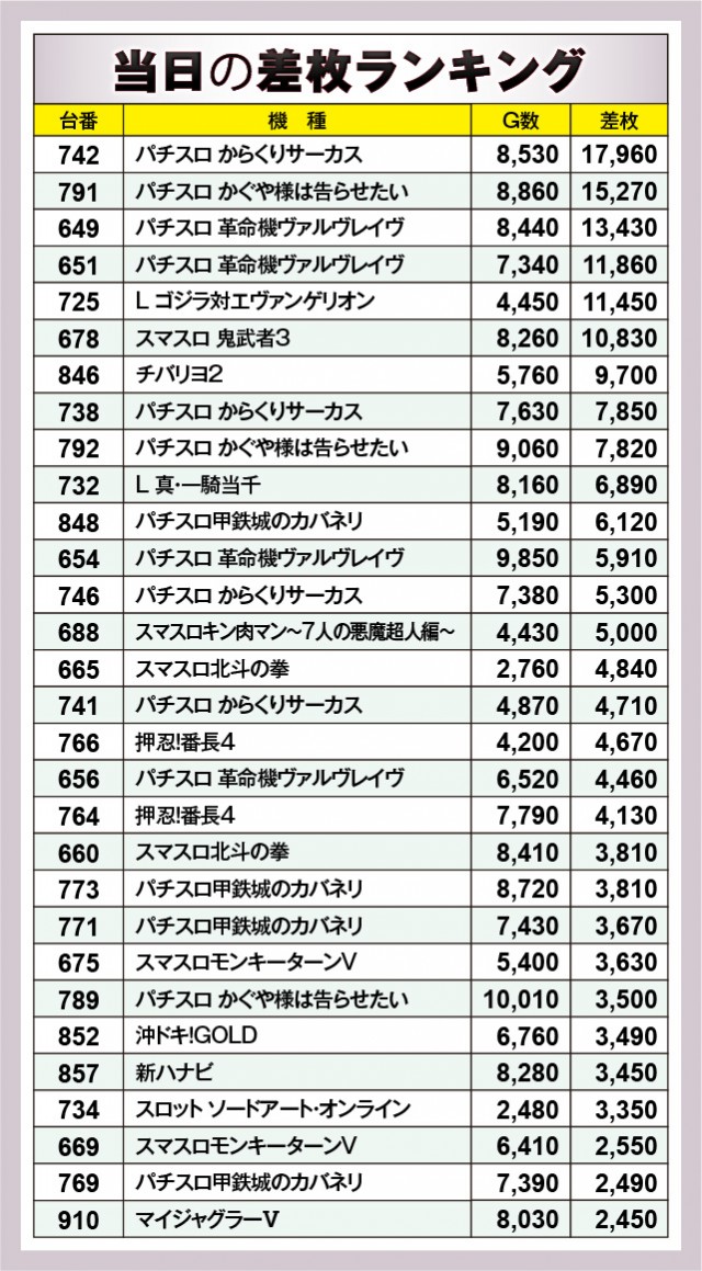 『パチスロ からくりサーカス』『パチスロ かぐや様は告らせたい』『パチスロ 革命機ヴァルヴレイヴ』『L ゴジラ対エヴァンゲリオン』『スマスロ 鬼武者3』と、当日は6台の万枚OVERが発生。SANKYO系機種がTOP30に多く名を連ねている格好で、遊技していたファンは有意義な時間を過ごしていたことだろう。また万回転OVERをはじめ、8~9,000回転OVER台も多く確認でき、確信を持ってレバーを叩いていた様子が窺える。