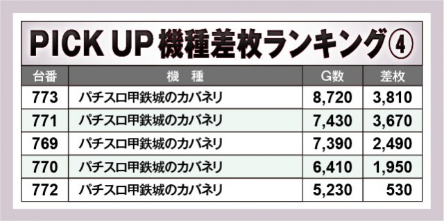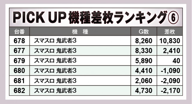 前述した万枚OVER台が優秀機種として名を連ねているのは当然ながら、そこに人気機種『スマスロモンキーターンV』と新台『スマスロ 鬼武者3』が割って入っている。両機種ともじっくりと打ち込まれた様子が顕著で、やはり期待感を持ってレバーを叩いていた。その中でメダル機『パチスロ甲鉄城のカバネリ』が全台プラス差枚数という大活躍を披露しており、存在感を放っていた事実から、館内全体が活気と熱気に包まれていたのが如実に窺えるばかりだ。