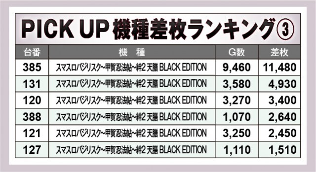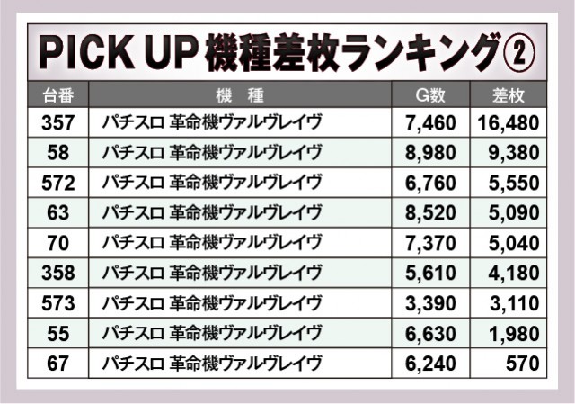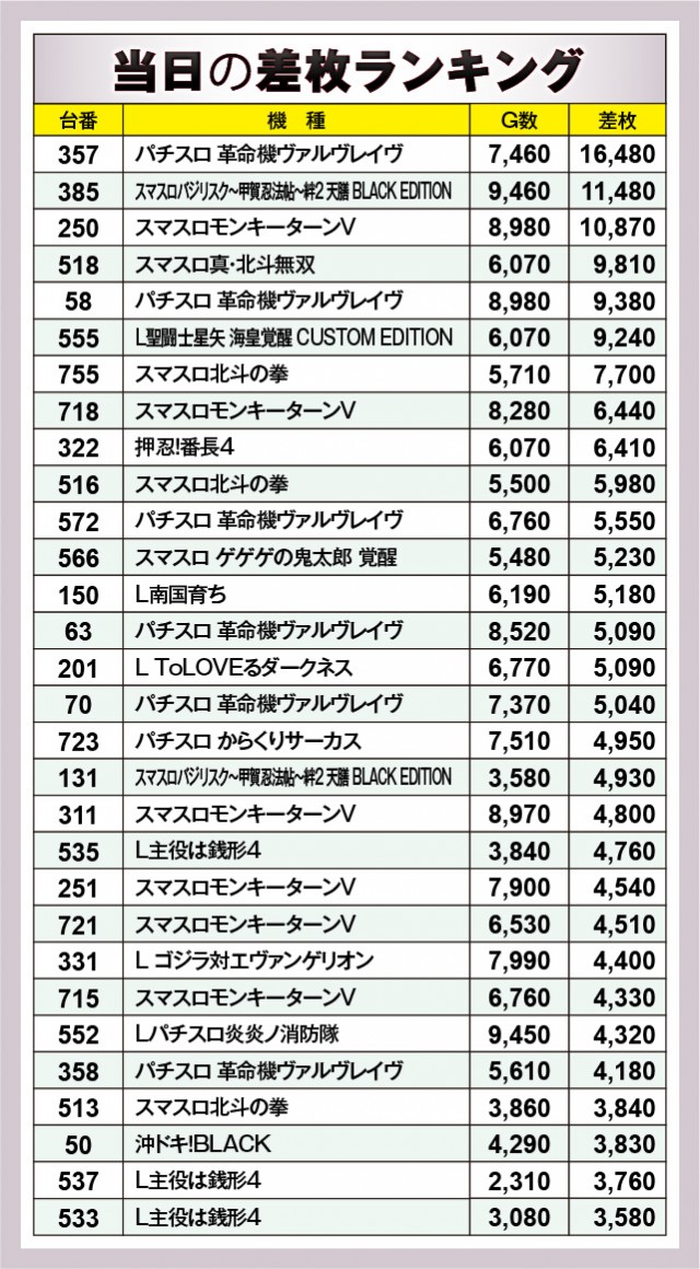 『パチスロ 革命機ヴァルヴレイヴ』『スマスロバジリスク~甲賀忍法帖~絆2 天膳 BLACK EDITION』『スマスロモンキーターンV』から万枚台が生まれており、さも当然のように大きな熱気を披露。さらに9,000枚OVERを達成した3機種も確認でき、大きな盛り上がりに包まれていたのは間違いない。じっくりと打ち込まれた形跡も見られ、ファンは有意義な時間を過ごしてと言える。