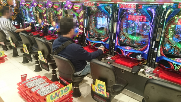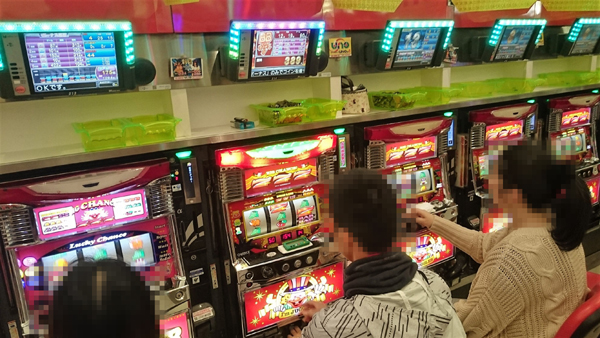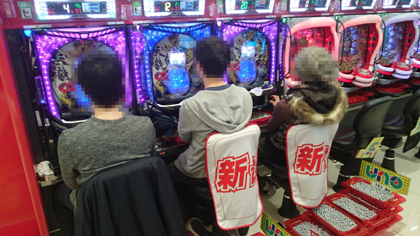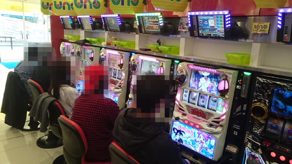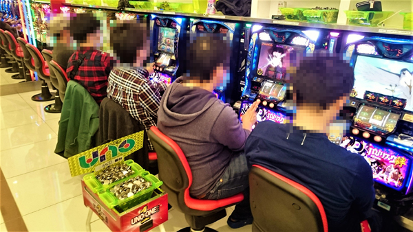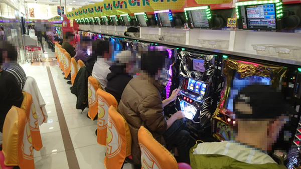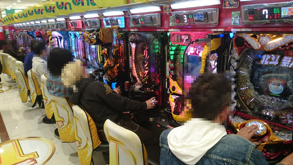 取材日は日曜日の午後とあって、パチンコ・パチスロともにたくさんのプレイヤーでにぎわいを見せていた。