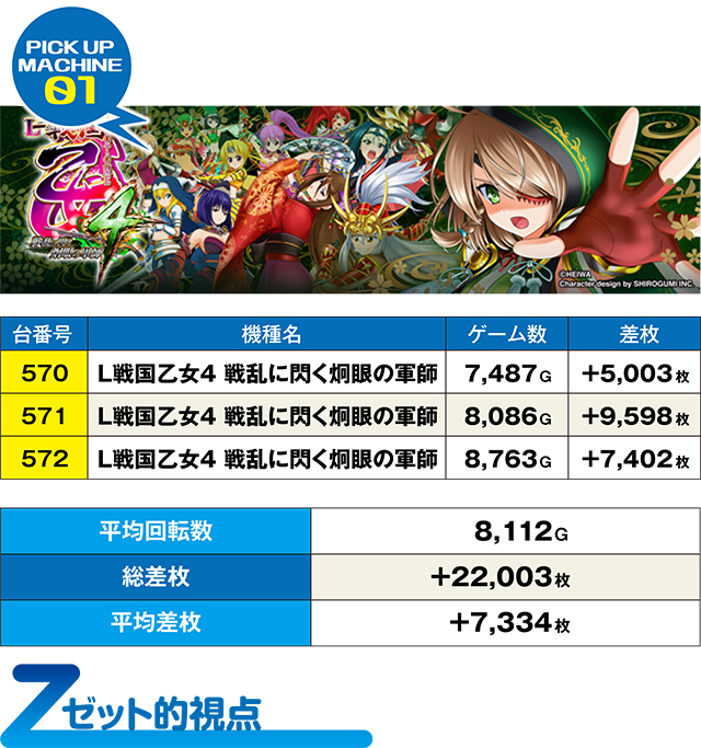 6台設置の『L戦国乙女4 戦乱に閃く炯眼の軍師』は、半数の3台がとんでもないことに…。ご覧の通り、3台ともが5,000枚オーバー、571番台に至っては9,500枚オーバーを達成!