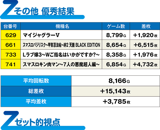 単品で好結果を生み出していたのが上の4台。注目は、多台数設置の『スマスロバジリスク~甲賀忍法帖~絆2 天膳 BLACK EDITION』から、少台数設置の『スマスロキン肉マン~7人の悪魔超人編~』まで、優秀台がそこかしこに潜んでいたことだ。
