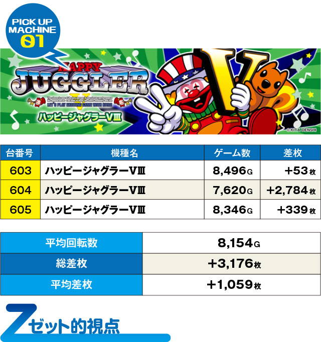 3台設置の『ハッピージャグラーⅤⅢ』は3台ともにプラス!特に604番台は+2,500枚を突破するほどの好調っぷりを披露し、全台系の可能性を高めてくれた!