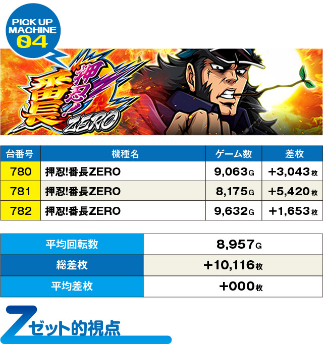 6台設置の『押忍!番長ZERO』は半数の3台が優秀台っぽい挙動でプラっていた。780・781番台は揃って+3,000枚を上回る好結果となっており、ニブイチなのでは?と勘繰らずにはいられない…。