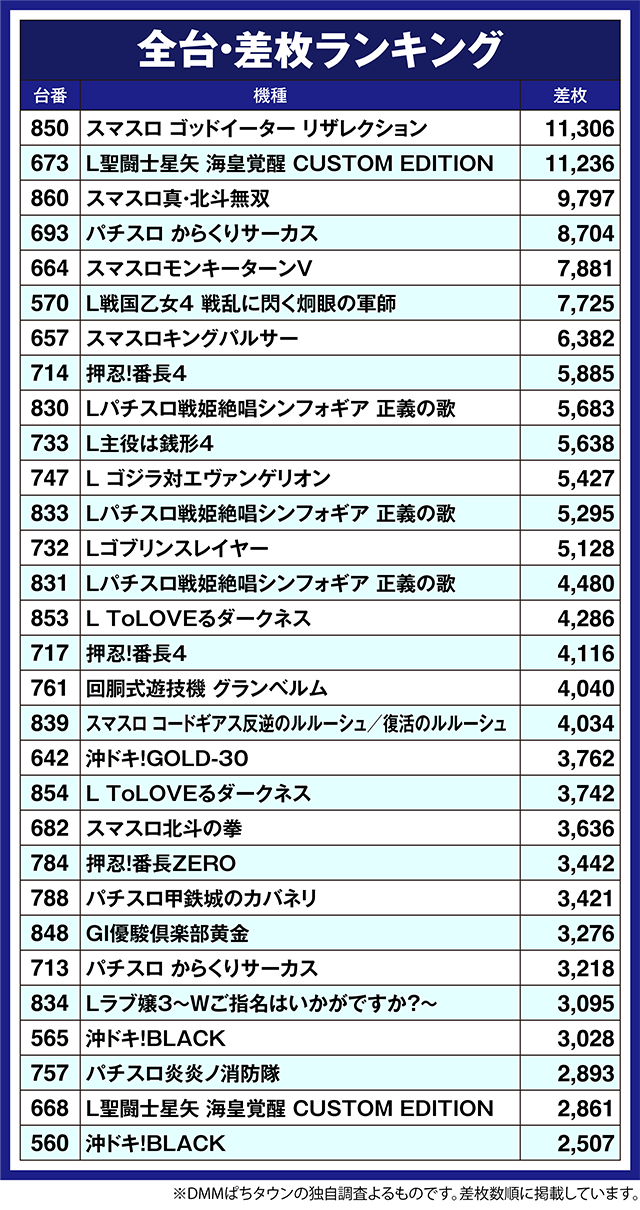ほかにも、「パチスロ からくりサーカス」の693番台は8,704pt、「スマスロモンキーターンV」の664番台は7,881ptと、多くの台が結果を残した。