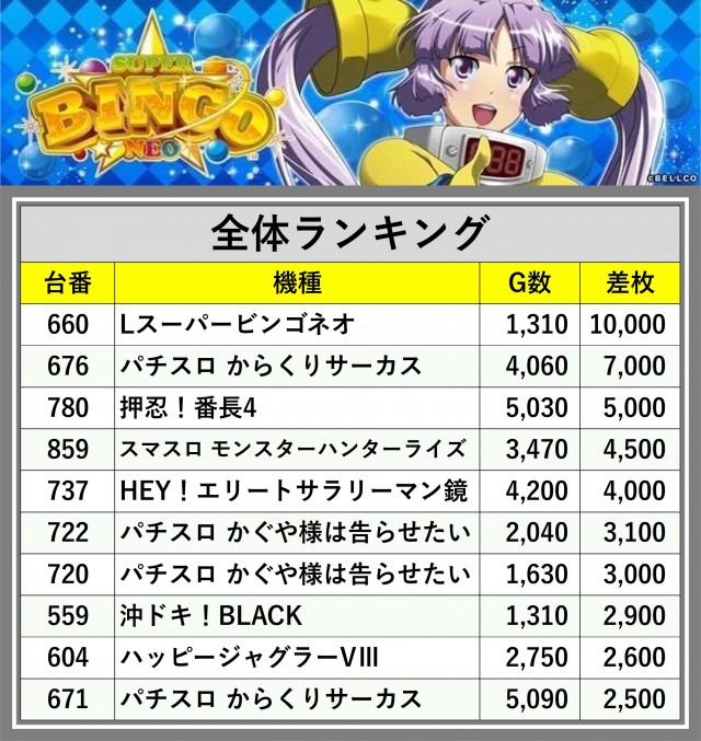 厳選された取材対象機種をはじめ、その他スロット全体から好記録が飛び出した!プレイヤーが楽しんだ1日を下記データにて振り返ってみて欲しい。