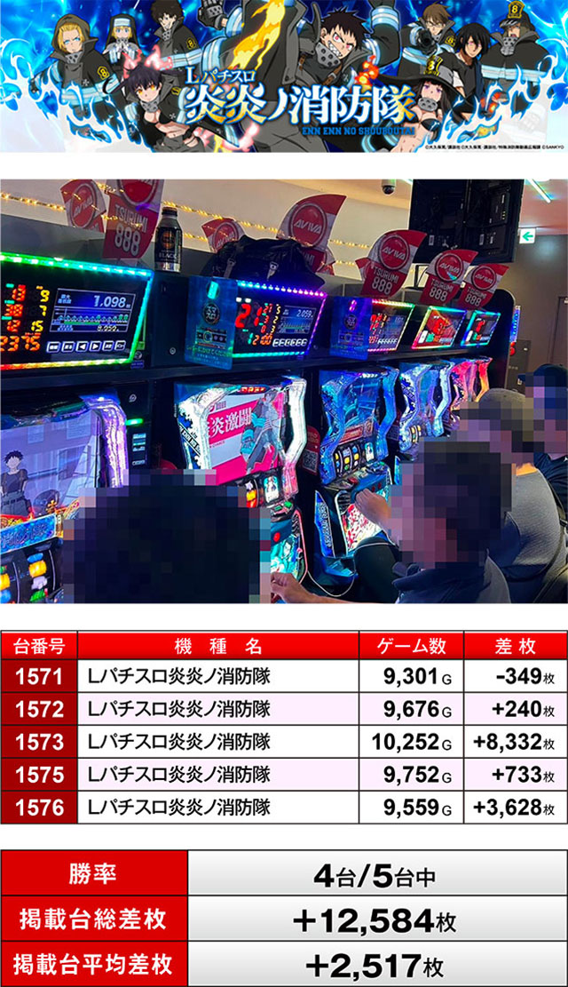 いち花も大好き『Lパチスロ炎炎ノ消防隊』は、5台中4台がプラスに。その中で猛威を振るっていたのは1573番台で、凄まじい勢いのまま8,000枚超えを達成!唯一のマイナス台もわずかなマイナス値だったことを踏まえると、前回と同じく全台にチャンスがあった…!?