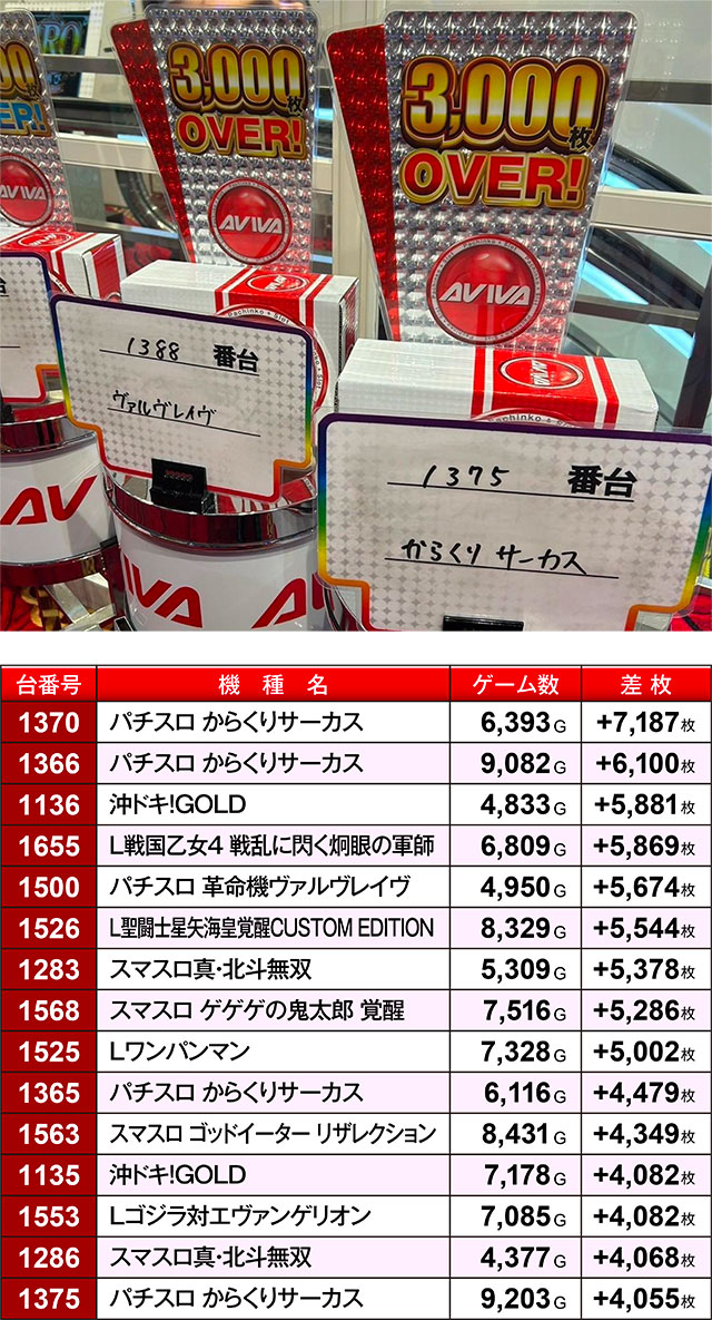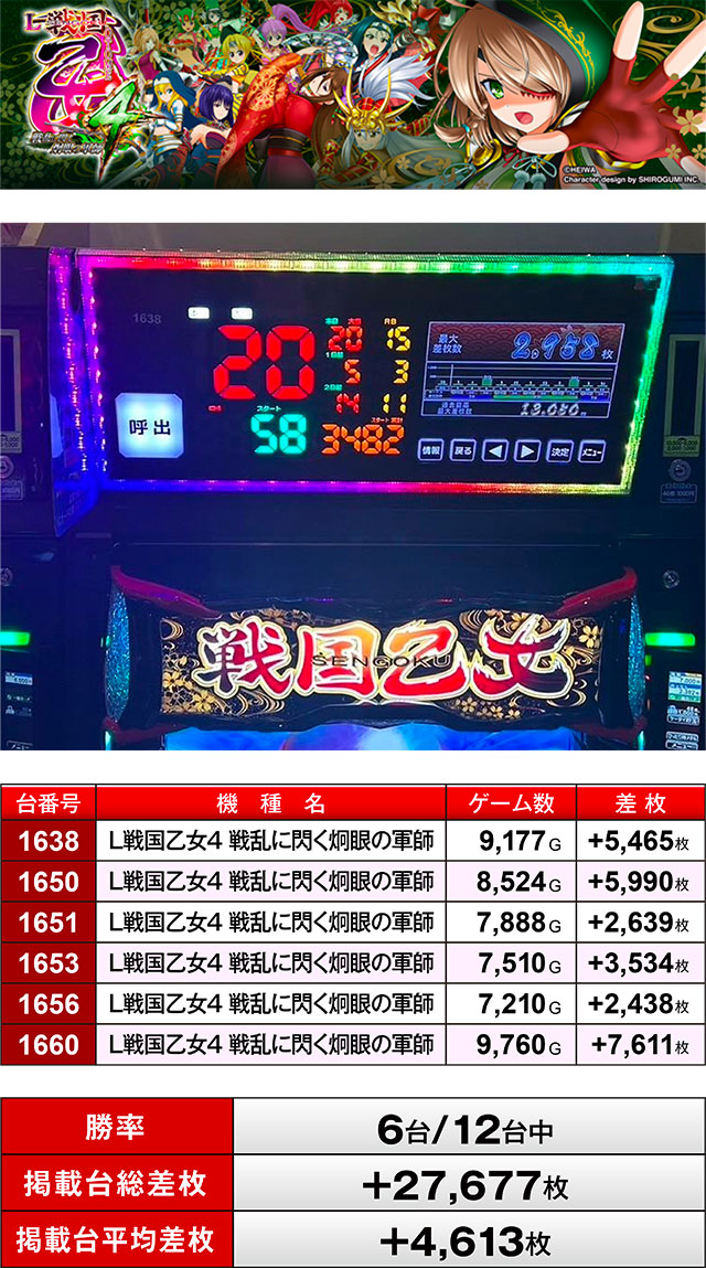 設置の半数の台がプラっていたのは12台設置の『L戦国乙女4 戦乱に閃く炯眼の軍師』。そのプラス台の数値はご覧の通りで、6台中3台が5,000枚を突破するほどの奮闘を見せてくれた。