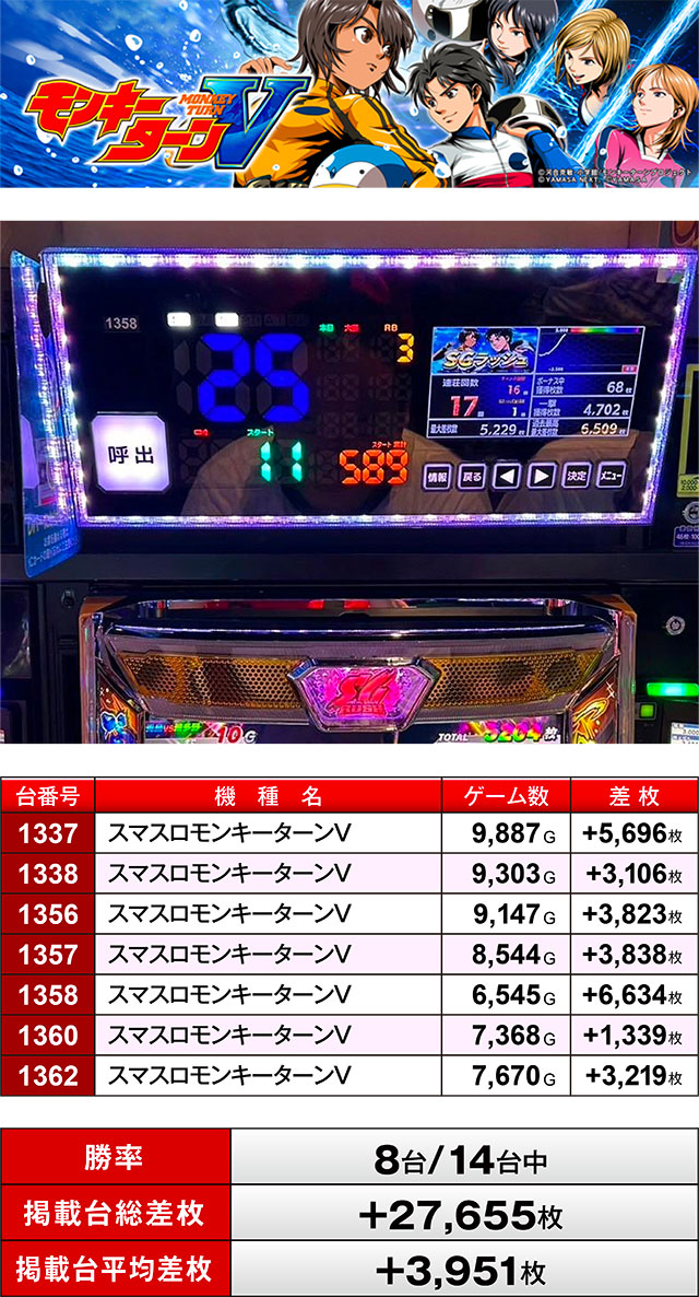 半数以上の台がプラス台だった『スマスロモンキーターンV』。特に上の7台はそのほとんどが3,000枚を上回っており、改めて同機のポテンシャルの高さを知らしめてくれた。朝から座った方は大正解…!