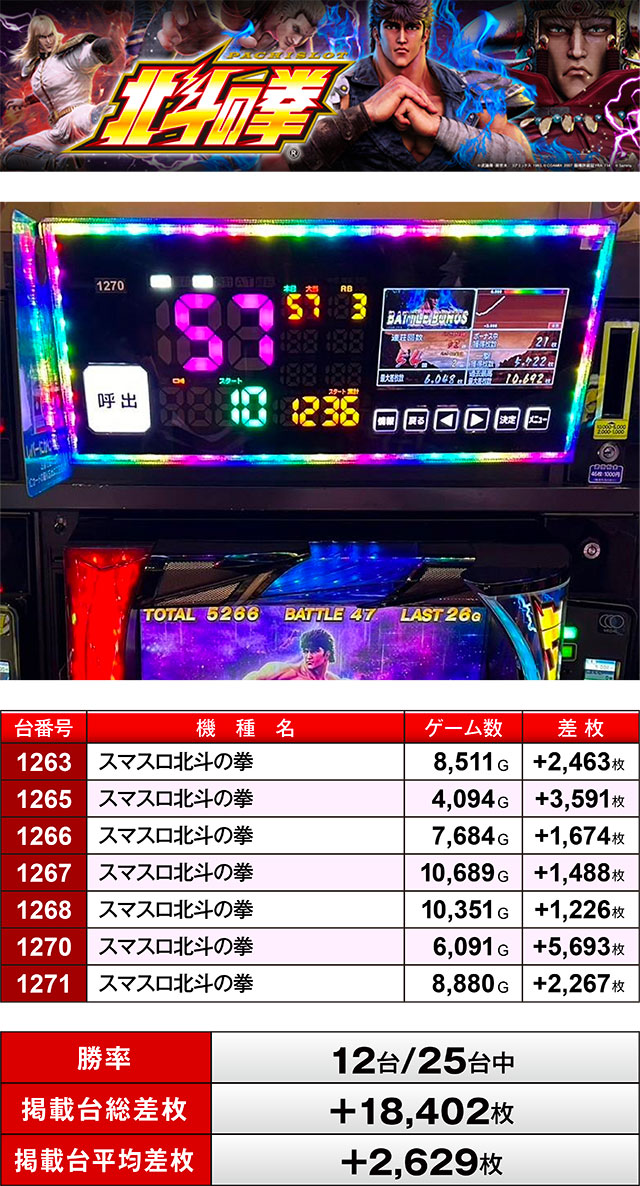 約半数の台がプラスという、上々の結果に終わった『スマスロ北斗の拳』。取材班がピックアップした7台は全てがプラス値をマークし、挙動も良好だった。「イチかバチか」取材にて毎回活躍を見せているだけに、次回も期待できそう…!?