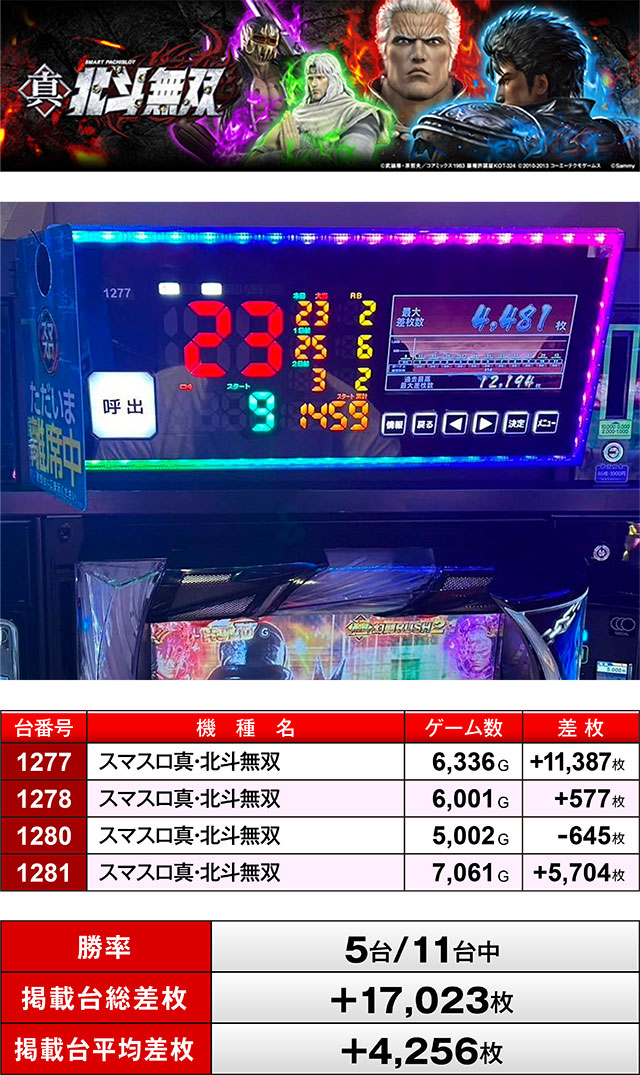 5,000枚オーバーのみならず、11,000枚オーバー記録も飛び出した『スマスロ真・北斗無双』。勝率こそ5割を切ってしまったものの、上記の2台は明らかに異質な挙動を見せていたようだ。