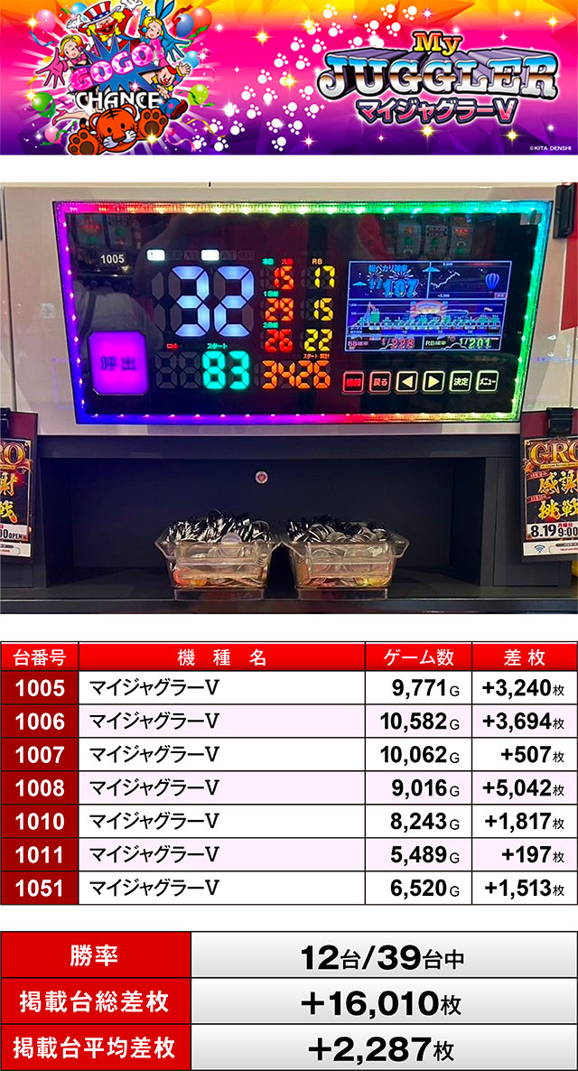 毎回多くのプラス台を生み出している『マイジャグラーⅤ』から、今回も多くのプラス台がお目見え。1005番台&1006番台が3,000枚超えを果たし、その力強さを見せつけたと思いきや、1008番台がさらにその上をいく5,000枚超えを達成した!