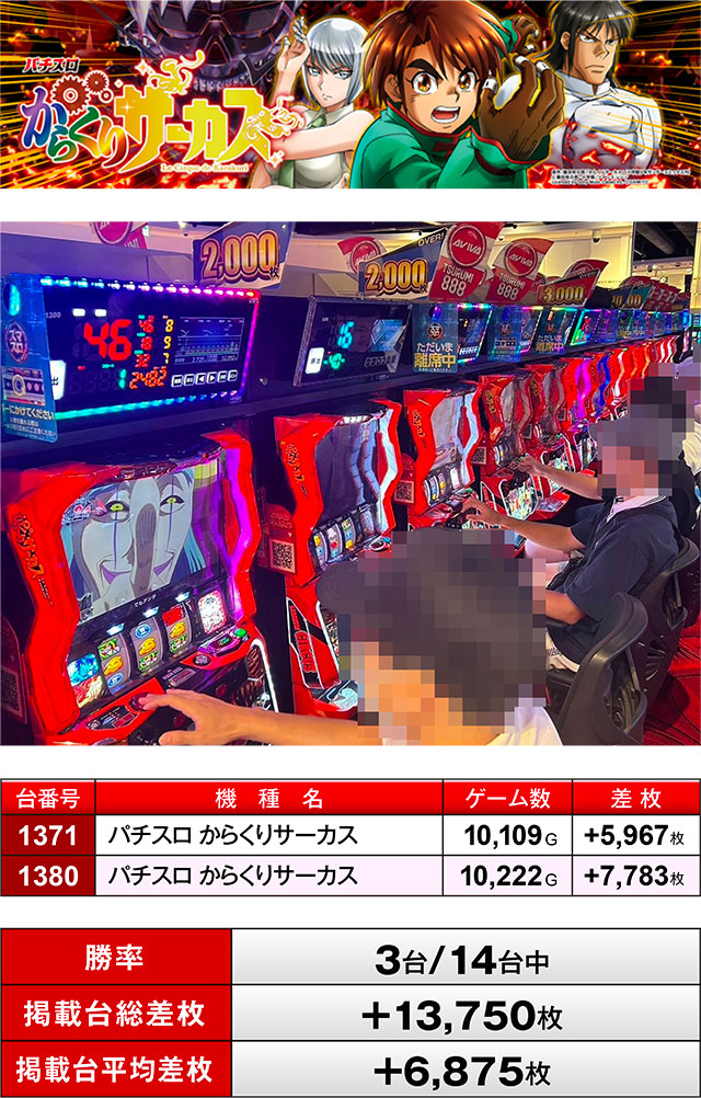 SANKYOマシンがあり得ないくらい強くなることで知られている「イチかバチか」取材。今回もやはりその傾向が強く見られ、特に『パチスロ からくりサーカス』がズバ抜けた結果を残してくれた。また、新台の『スマスロ ゲゲゲの鬼太郎 覚醒』『Lワンパンマン』から好結果が生まれていたことも評価したい。