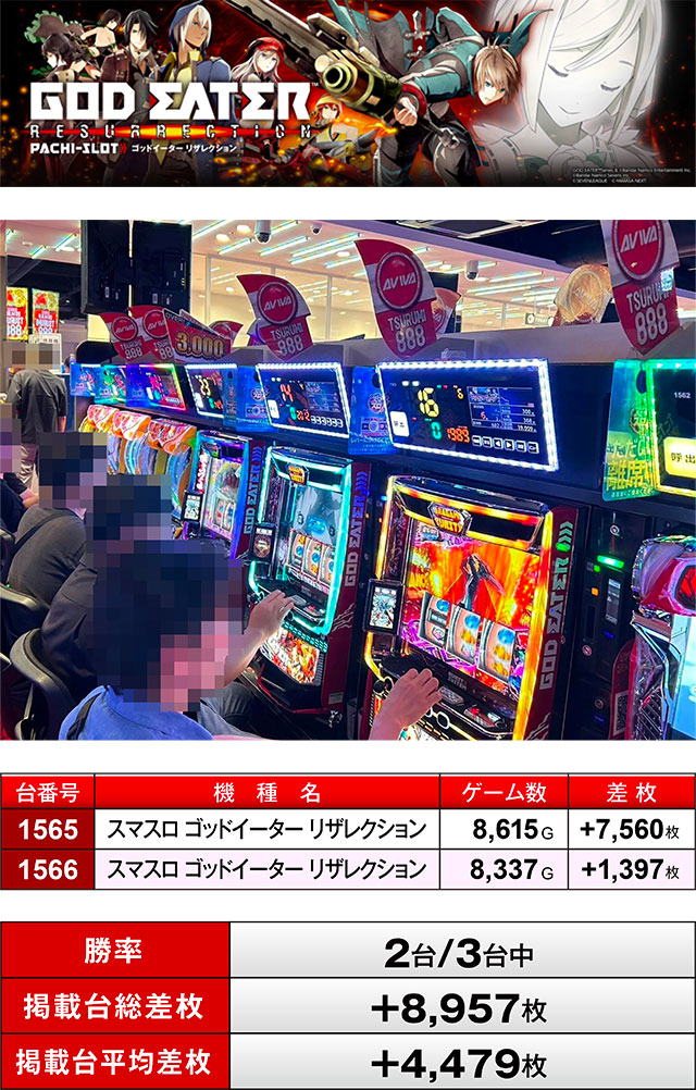 3台中2台がプラス、さらに1565番台が7,500枚を突破!設置台数こそ3台と少ないものの、この状況が遊びに来ていたユーザーたちに大きなインパクトを与えたのは間違いなさそうだ。